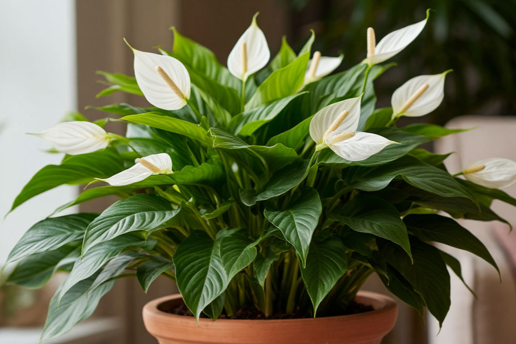 Спатифиллум известен своими утончёнными белыми цветами с длинным початком в центре. Не переносит сквозняков и избытка влаги, а также требует защиты от прямых солнечных лучей.